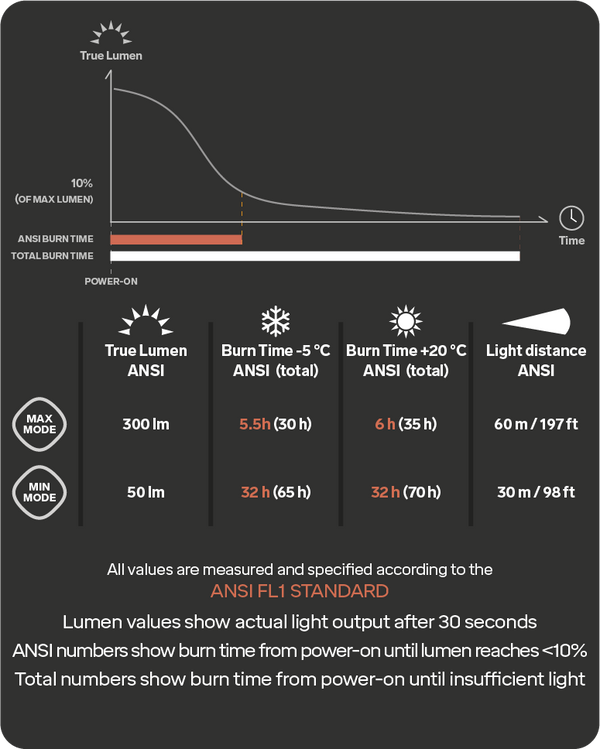 - Max mode: 300 lm / 5.5-6 h burn time / 60 m (197 ft) light distance